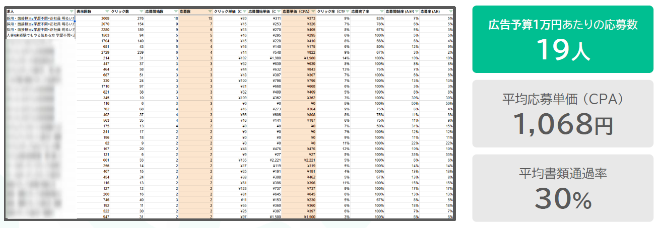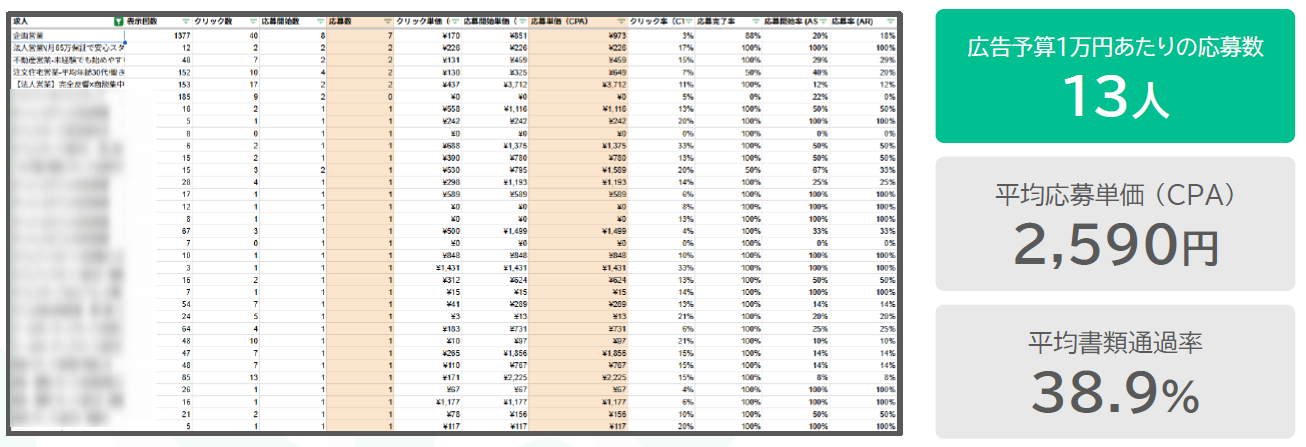 平均応募単価1,242円・月間1,400名の応募を獲得しております。