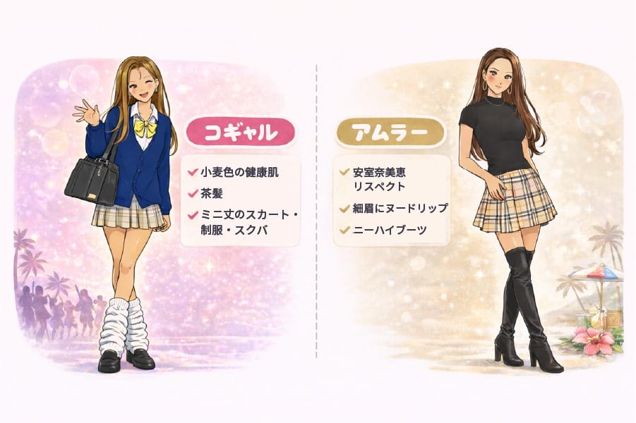 - 特徴(コギャル):小麦色の健康肌・細眉・薄めブラウンメイク