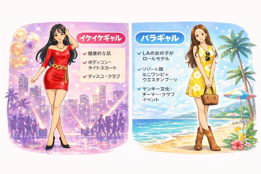 - ファッション:ボディコン・タイトスカート(イケイケ)/ リゾート風ミニワンピ+スポーティースニーカー・ウエスタンブーツ(パラギャル)