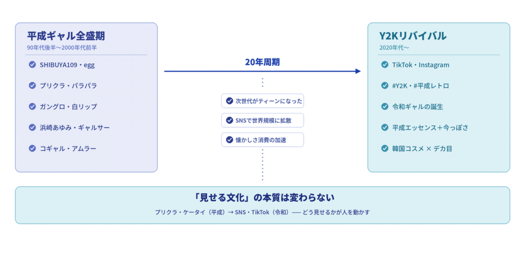 平成ギャル文化は偶然生まれたものではありません。時代の閉塞感・テクノロジーの変化・若者の自己表現欲求が重なったことで生まれ、今また20年周期でリバイバルしています。この流れを理解すると、トレンドがどう生まれ、どう広がるかが見えてきます。