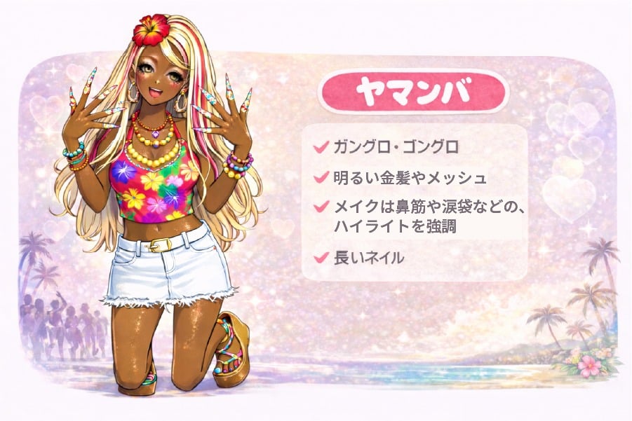 - 特徴:ガングロ・ヤマンバの黒肌・金髪ハイブリーチ・白リップ・デカ目・ロングネイル