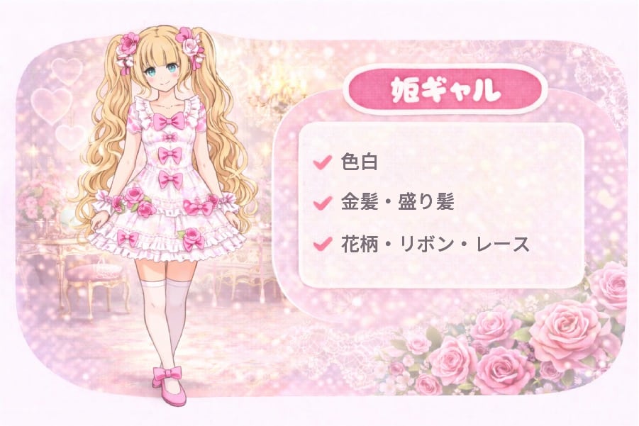 - 特徴:白ギャル(色白・金髪・可愛いメイク)・姫ギャル(盛りヘア・ゴージャス系)・お姉ギャル(セクシー系)